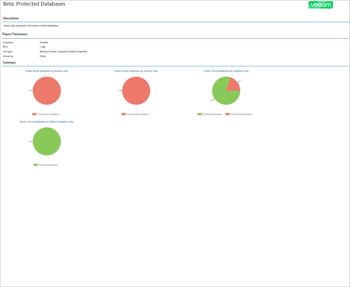 - The report charts display information about the number of databases protected with backup jobs, archive backup jobs, snapshots and replica snapshots.