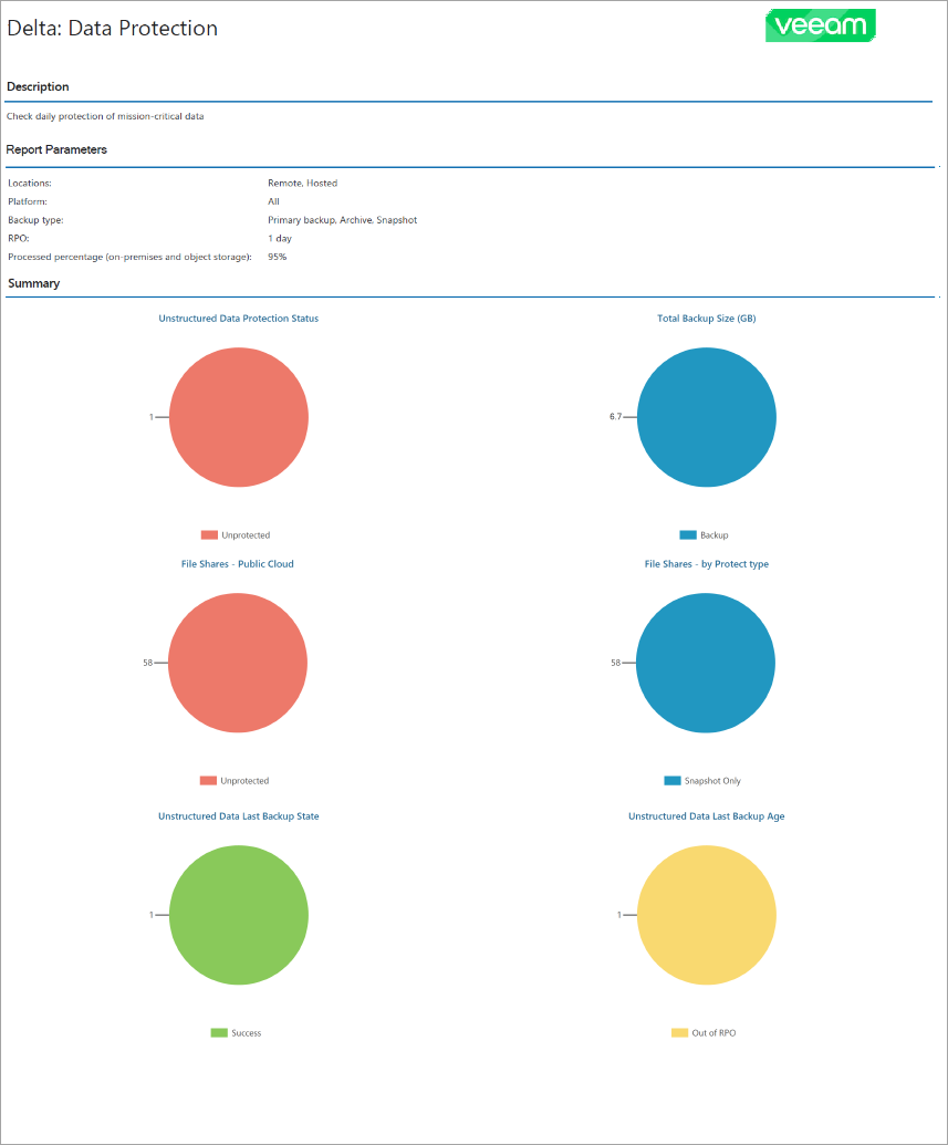 The Protected Data Backup report analyzes the efficiency of file share and object storage data protection with Veeam Backup & Replication and Veeam Backup for Public Clouds.