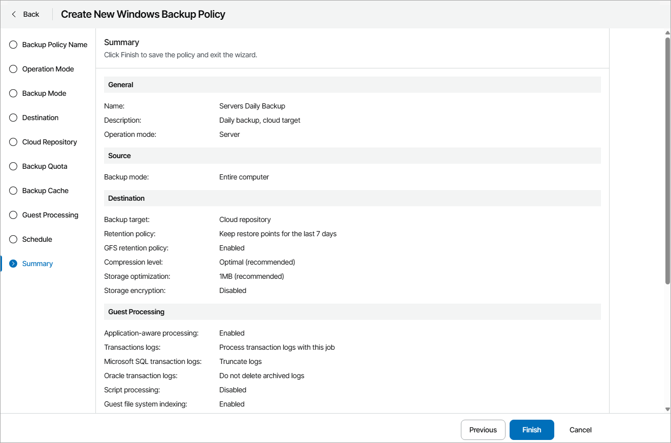 This is an archive version of the document. To get the most up-to-date information, see the current version. Step 18. Review Backup Policy Settings At the Summary step of the wizard, review settings of the configured backup policy and click Finish.