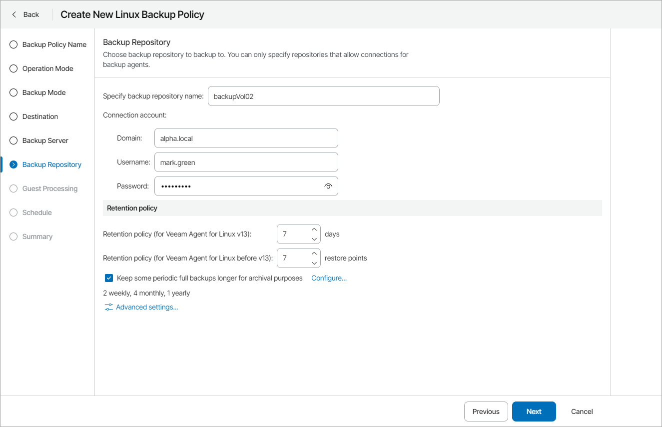 Permissions on the backup repository managed by the target Veeam backup server must be granted beforehand. For details, see section Setting Up User Permissions on Backup Repositories of the Veeam Agent for Linux User Guide.