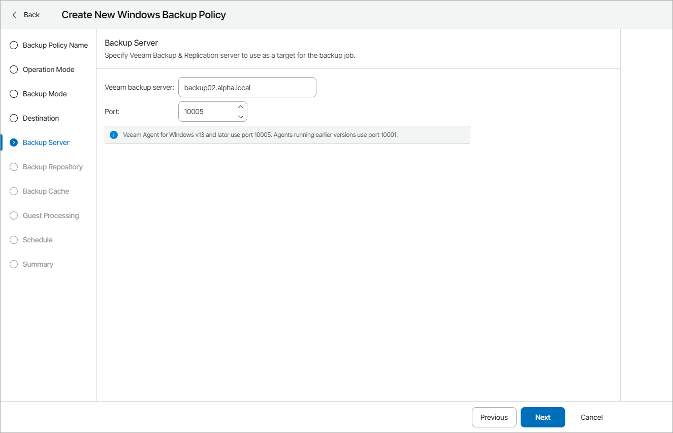 By default, Veeam Agent for Microsoft Windows version 13 or later uses port 10005. Earlier Veeam Agent for Microsoft Windows versions use port 10001.