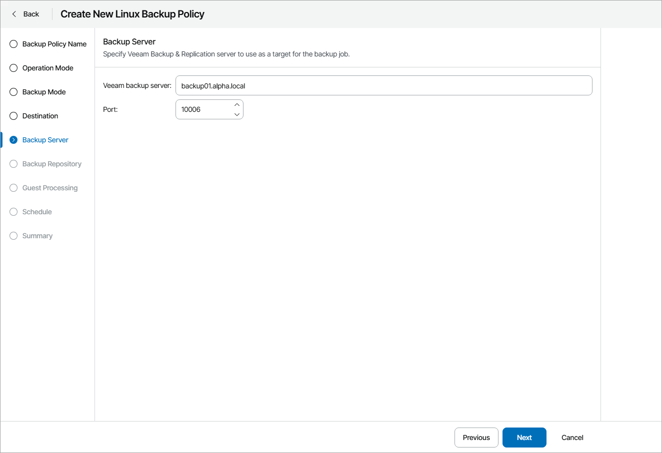 The Backup Server step of the wizard is available if at the Destination step you have chosen to store backup files on a Veeam backup repository.