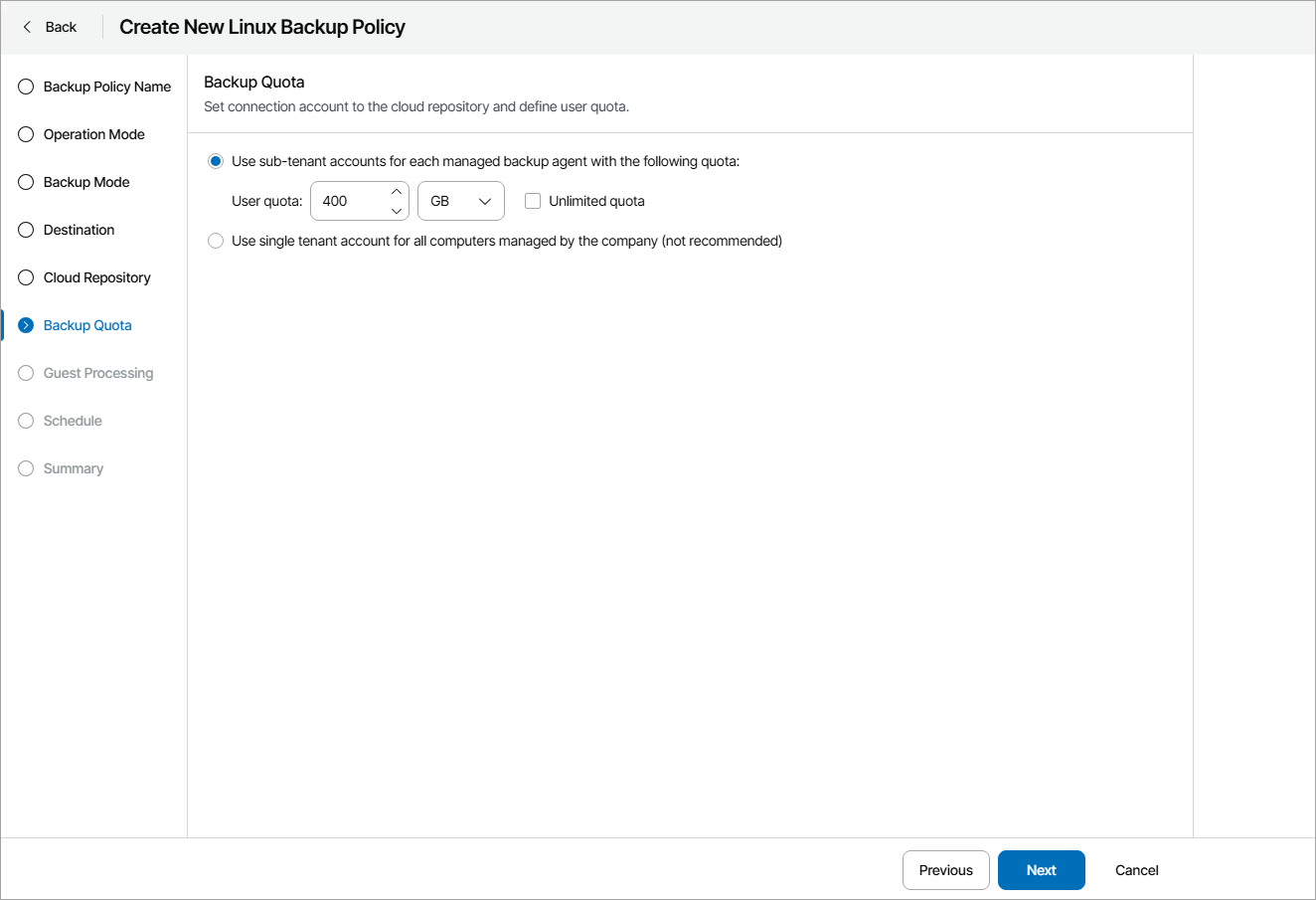 The Backup Quota step of the wizard is available if at the Destination step you have chosen to save backup files on a Veeam Cloud Connect repository.