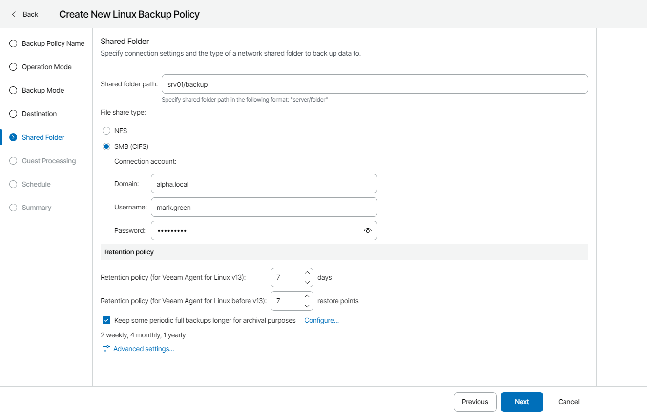 - For Veeam Agent for Linux version 13 or later: In the Retention policy (for Veeam Agent for Linux v13) field, specify the number of days for which you want to keep backups in the target location. By default, Veeam backup agent keeps backup files for 7 days. After this period is over, Veeam backup agent will remove the earliest restore points from the backup chain.