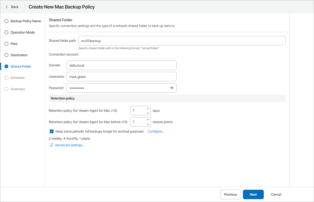 - In the Connection account fields, specify domain name and user name and password of the account that has access permissions on this shared folder.