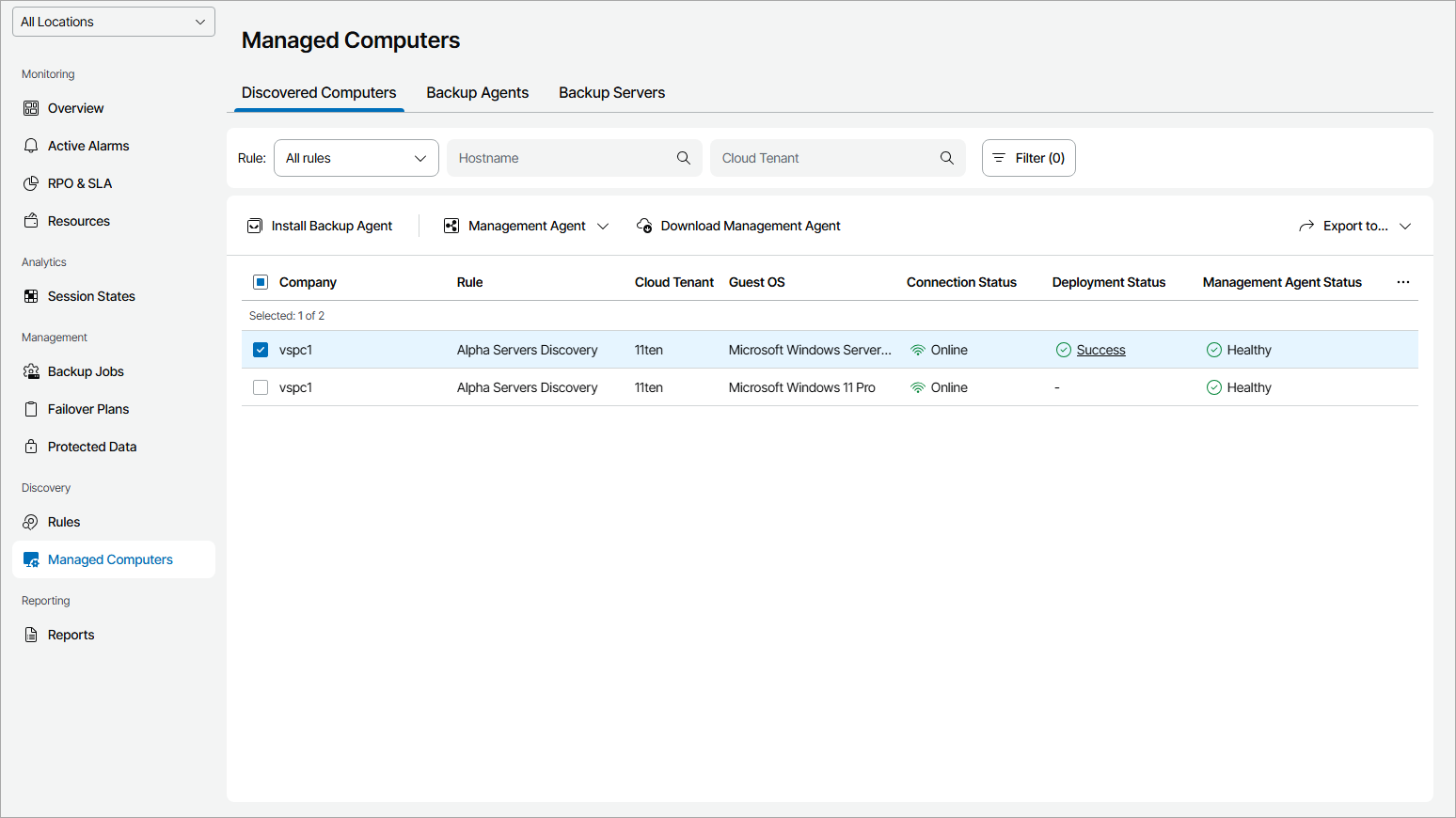 - Management agent status — limit the list of computers by the Veeam Service Provider Console management agent connection status (Healthy, Warning, Error, Not installed, Rejected).