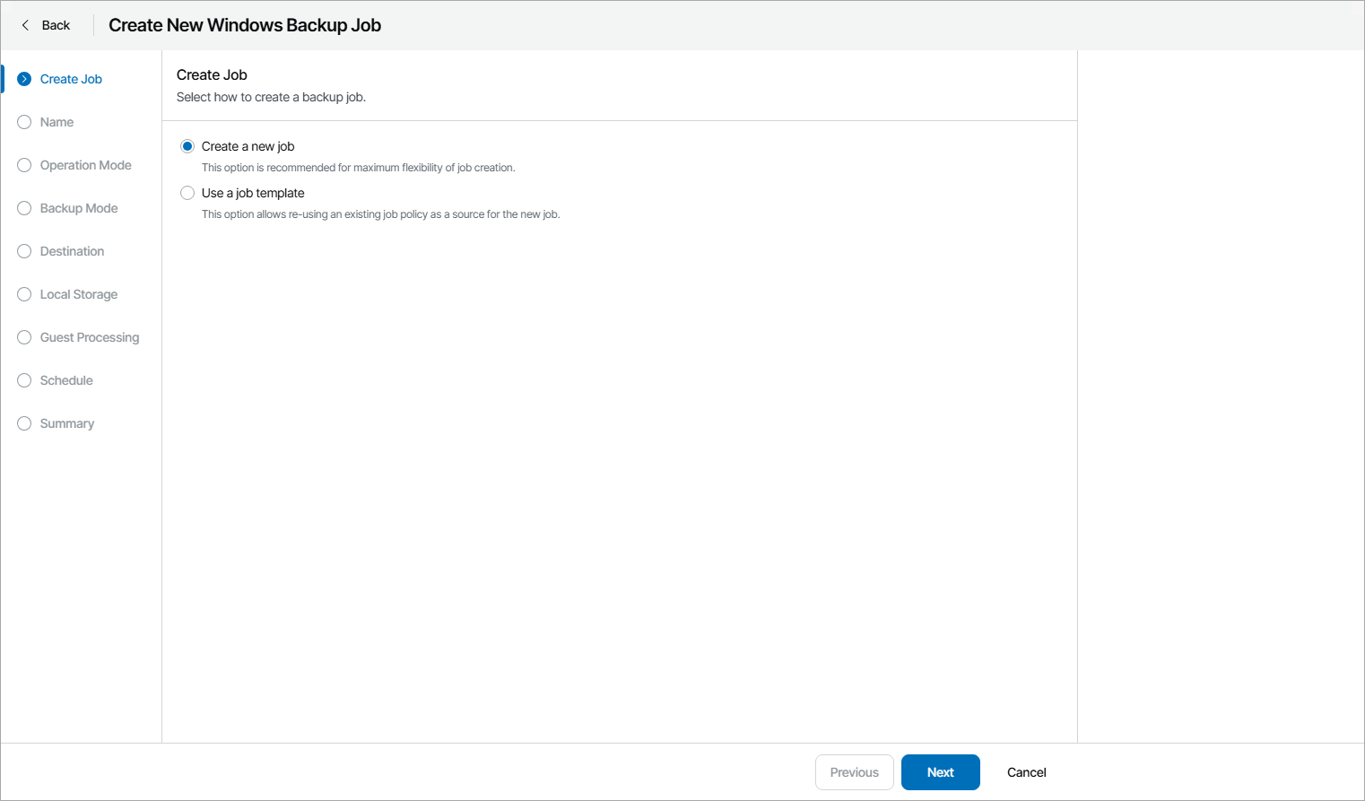 - At the Create Job step of the New Backup Job wizard, select one of the following options: