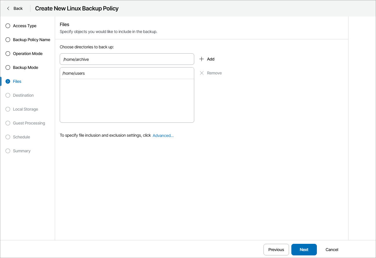 The Files step of the wizard is available if at the Backup Mode step you have chosen to create a file-level backup.