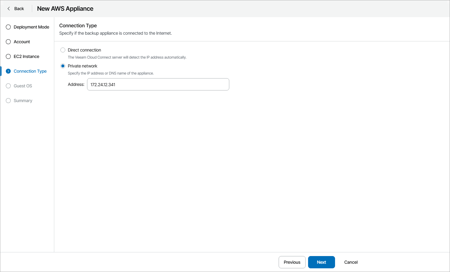 - If the appliance is connected directly to the internet, and you want Veeam Cloud Connect server to be connected to the appliance also through the internet, select Direct connection. In this case, Veeam Cloud Connect will detect the IP address of the Veeam Backup for AWS appliance automatically.