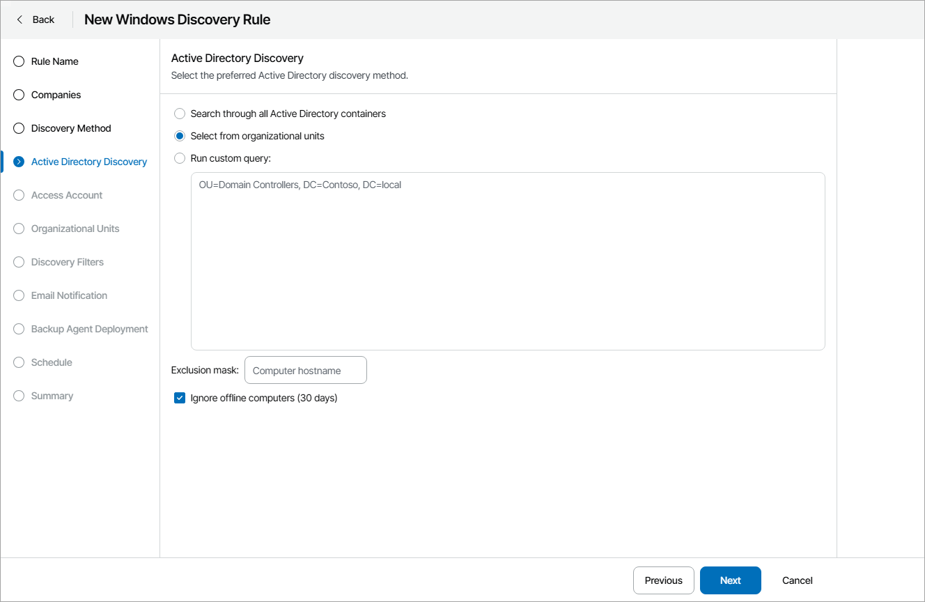 - Select Select from organizational units to discover computers that are included in selected organizational units only.