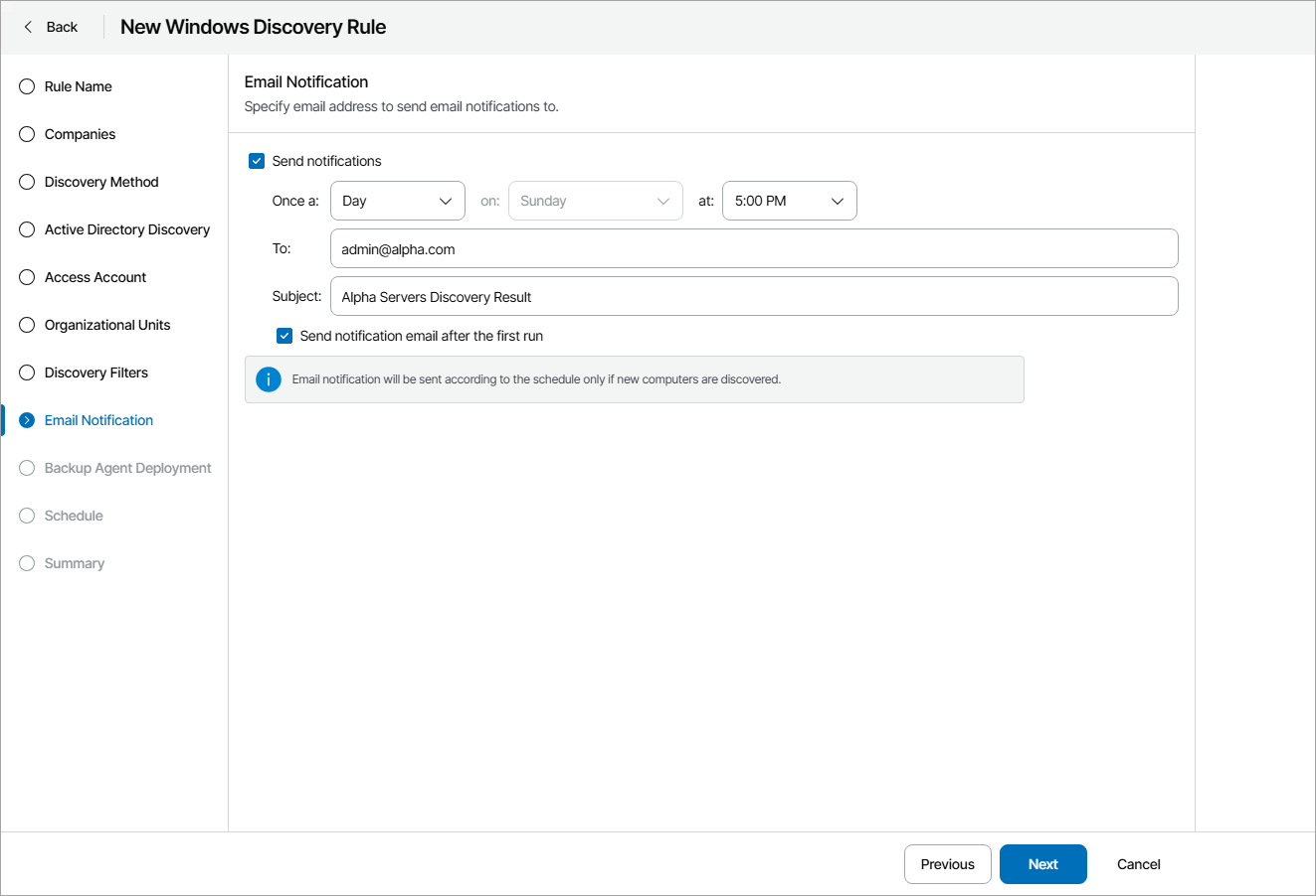 - At the Email Notification step of the wizard, you can enable notifications about discovery results by email.