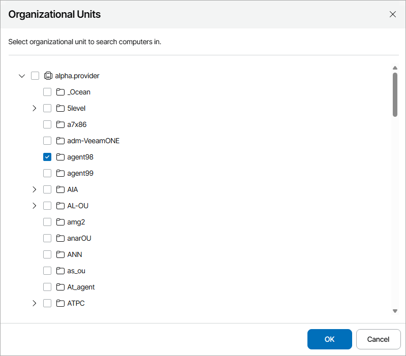 - In the Organizational Units window, select check boxes next to units that must be included to the discovery scope.
