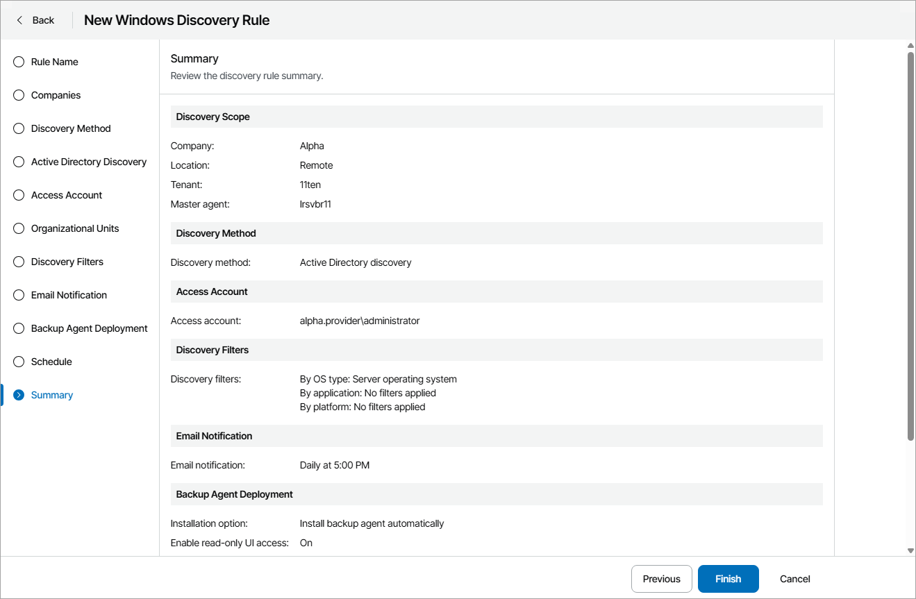 - At the Summary step of the wizard, review discovery rule settings and click Finish.