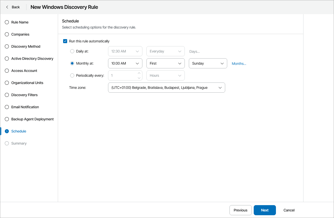 - At the Schedule step of the wizard, specify schedule according to which discovery must be performed: