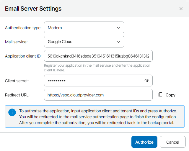 You will be redirected to your mail service provider page. After you complete the authentication, you will be redirected to Veeam Service Provider Console portal and the mail server settings will be saved automatically.
