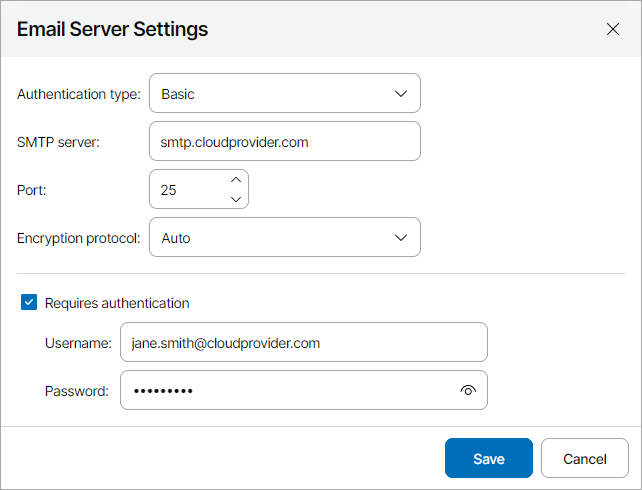 - If the SMTP server requires authentication, select the Requires authentication check box and specify authentication credentials in the Username and Password fields.