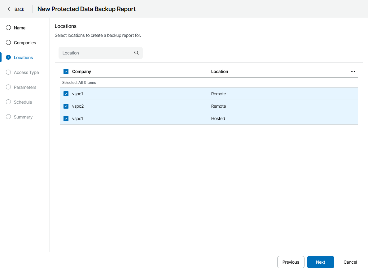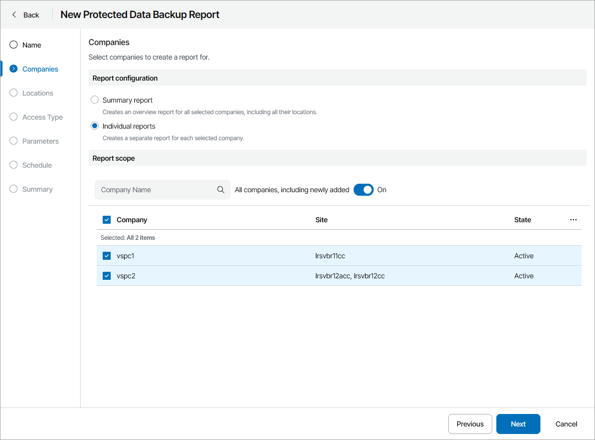 If you select more than one company for Individual reports report type, Veeam Service Provider Console will create a separate report configuration for each selected company. If you select more than one company for Summary report report type, Veeam Service Provider Console will include data on all selected companies in the report.