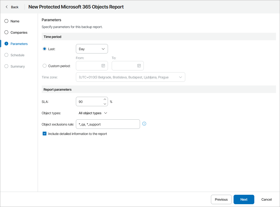 - At the Parameters step of the wizard, specify parameters for analyzing protected Microsoft 365 objects:
