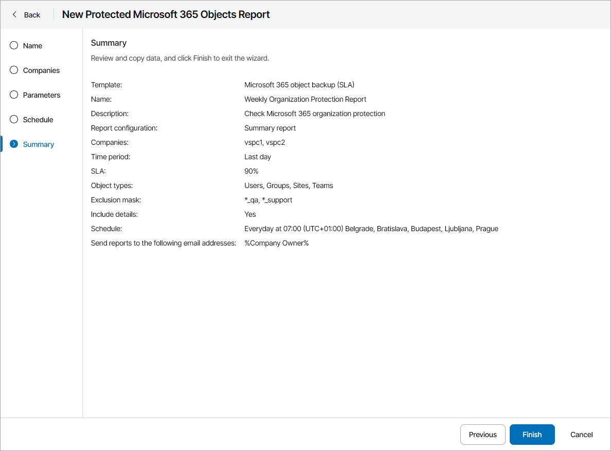 If you select more than one company for Individual reports report type, Veeam Service Provider Console will create a separate report configuration for each selected company. If you select more than one company for Summary report report type, Veeam Service Provider Console will include data on all selected companies in the report.