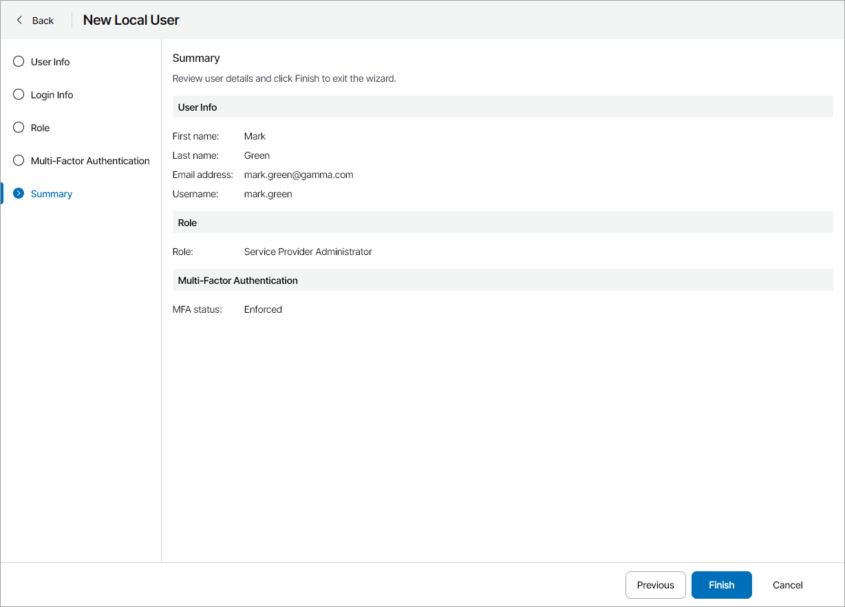 - At the Role step of the wizard, from the Role drop-down list, choose Service Provider Administrator.