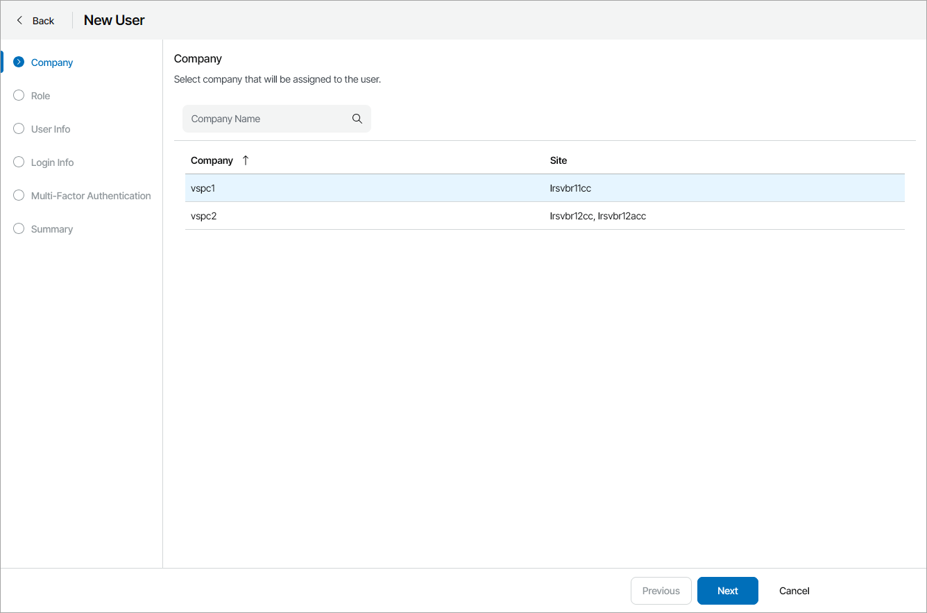 1. At the Company step of the wizard, select the company for which the user will be created.