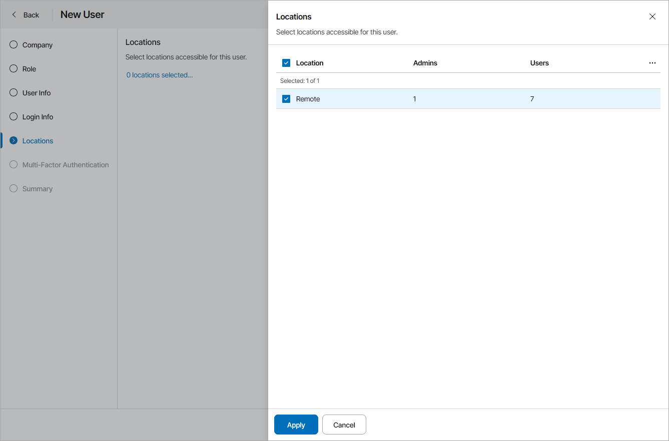 You can create new users with the Location User role. These users can only work with the functionality available in the Veeam Service Provider Console Client Portal. Data available to a Location User can be limited to one or more company locations, and the user can access data pertaining to all managed Veeam backup agents, Veeam Backup & Replication, Veeam Backup Enterprise Manager, Veeam ONE and Veeam Backup for Microsoft 365 servers in these locations.
