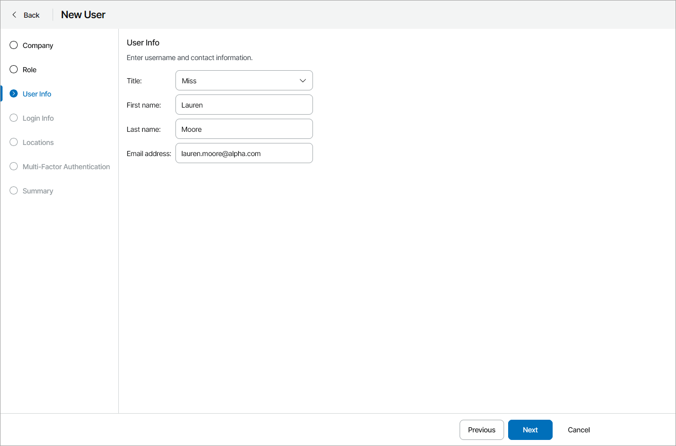 2. At the User Info step of the wizard, specify user title, first name, last name, and email address.