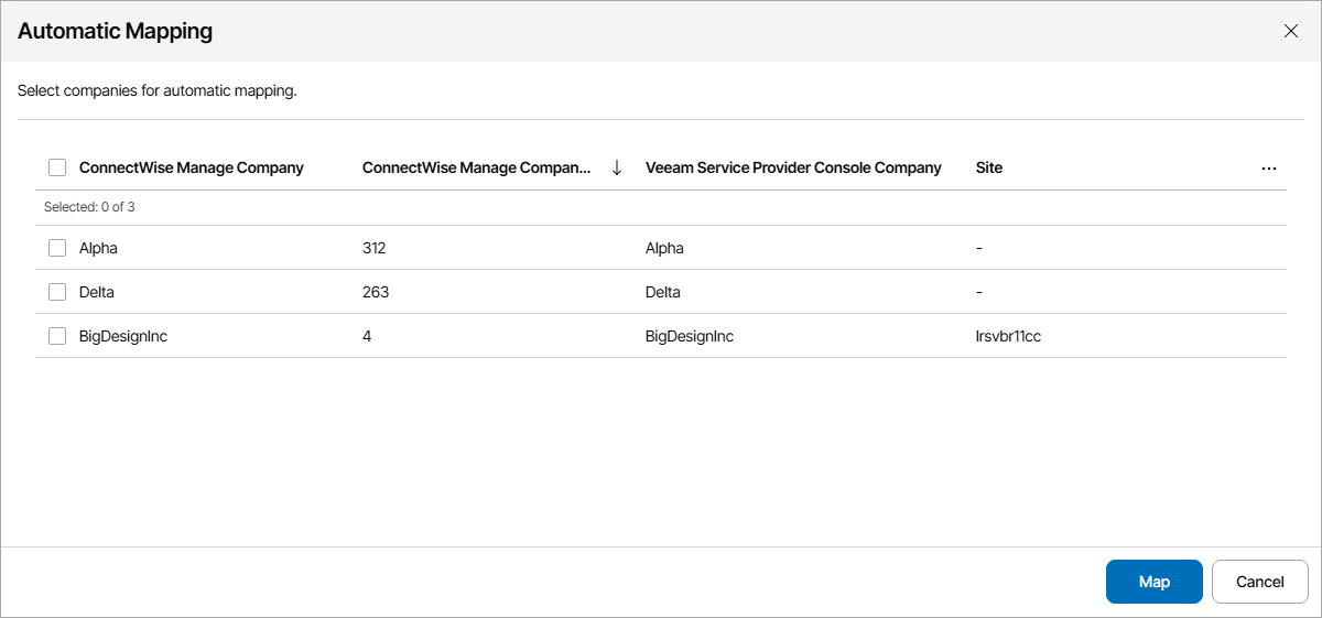 Select this method if names of companies you manage in Veeam Service Provider Console are same or similar to their IDs in ConnectWise Manage.