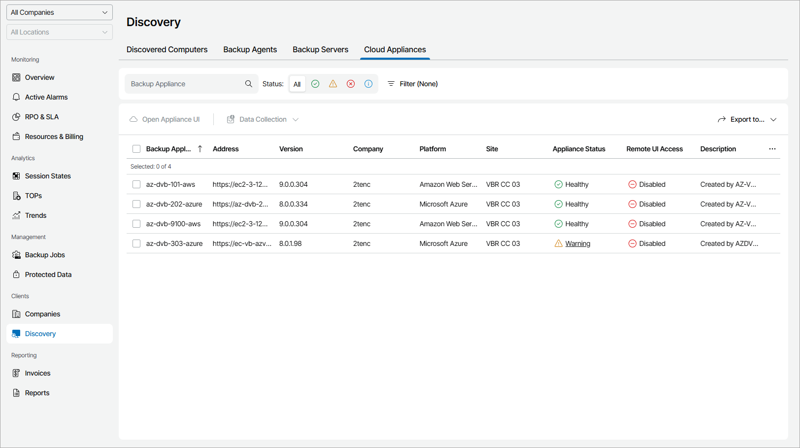Veeam Service Provider Console will display a list of all managed Amazon Web Services, Microsoft Azure and Google Cloud appliances.