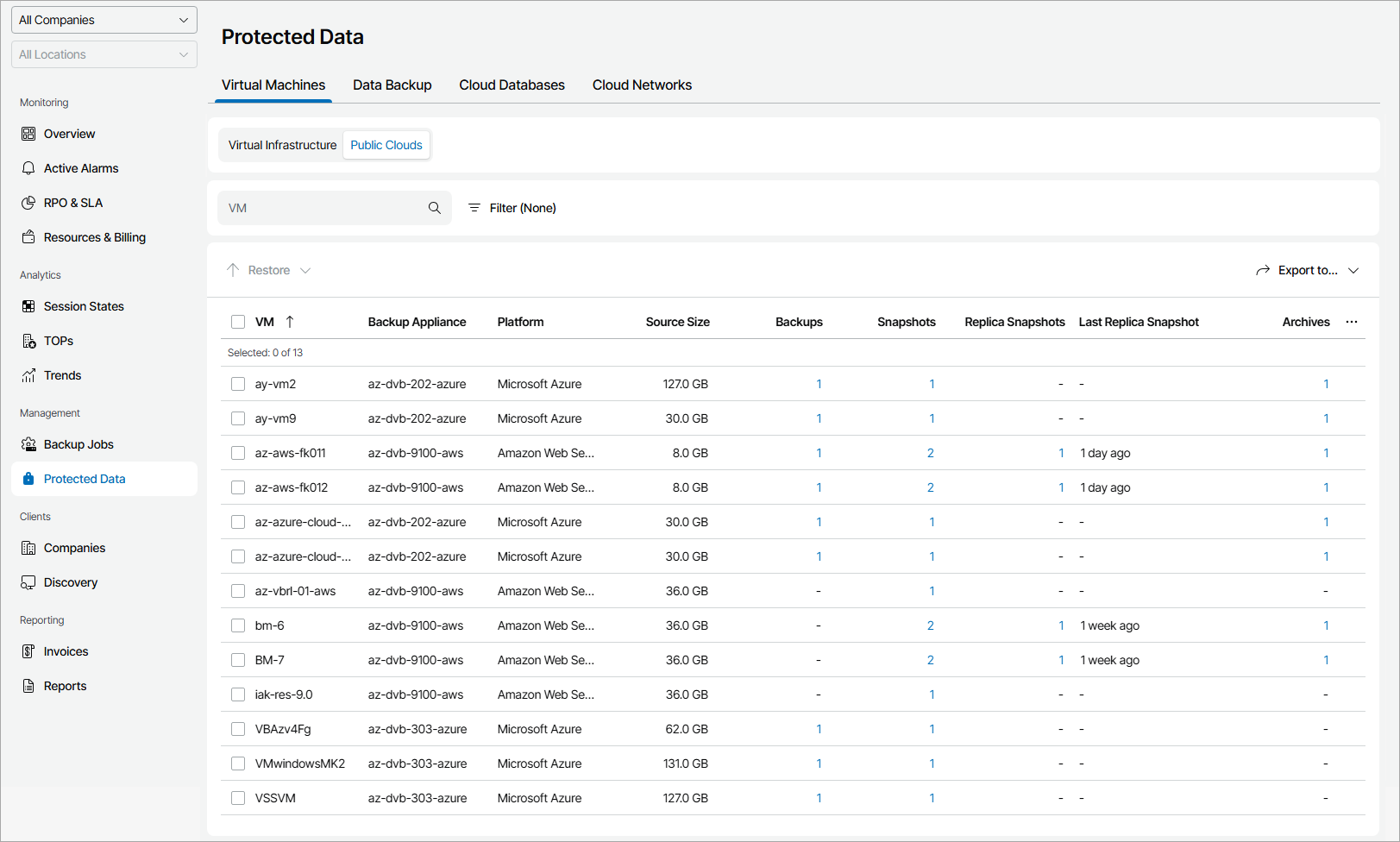 Veeam Service Provider Console will display a list of all VMs protected by Veeam Backup for Public Clouds.