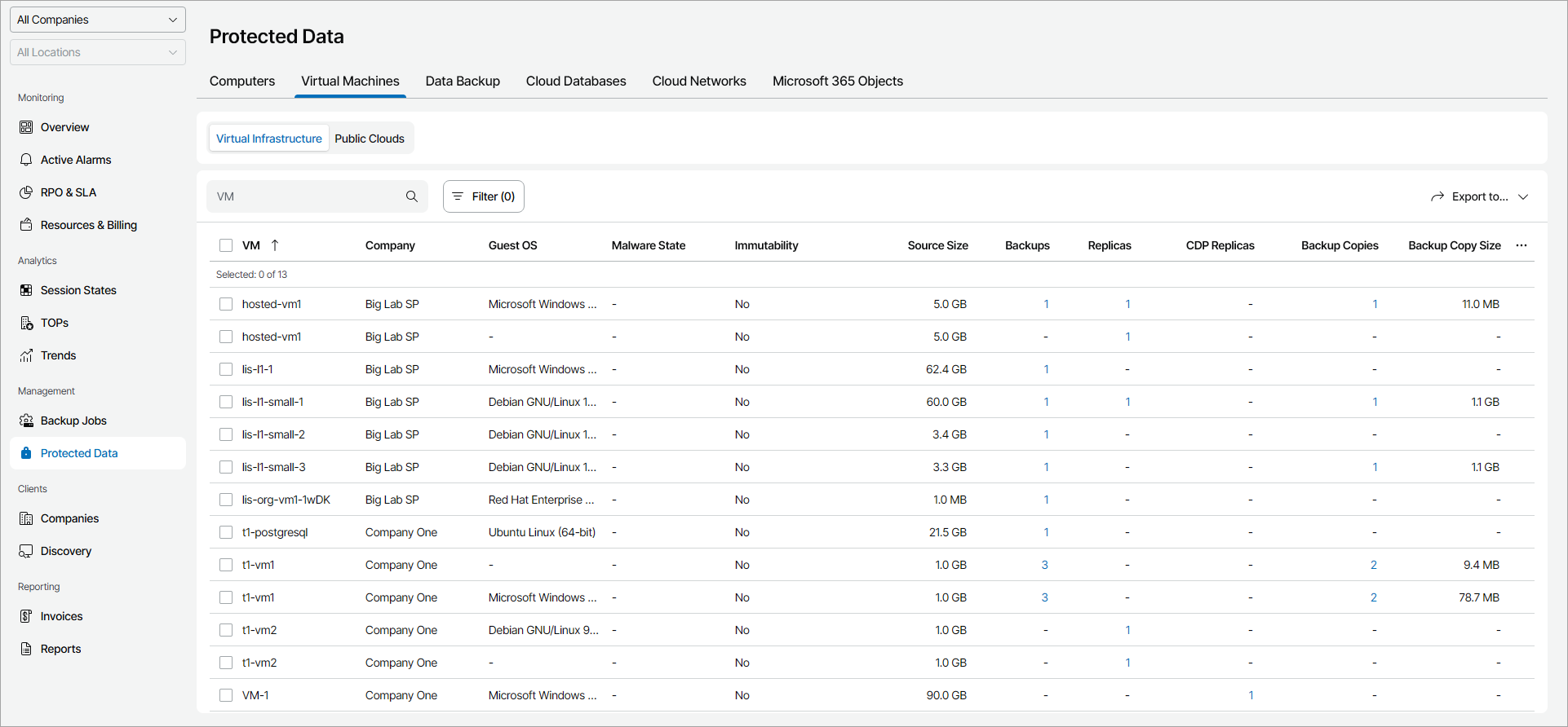 Veeam Service Provider Console will display a list of all VMs protected by managed backup servers.
