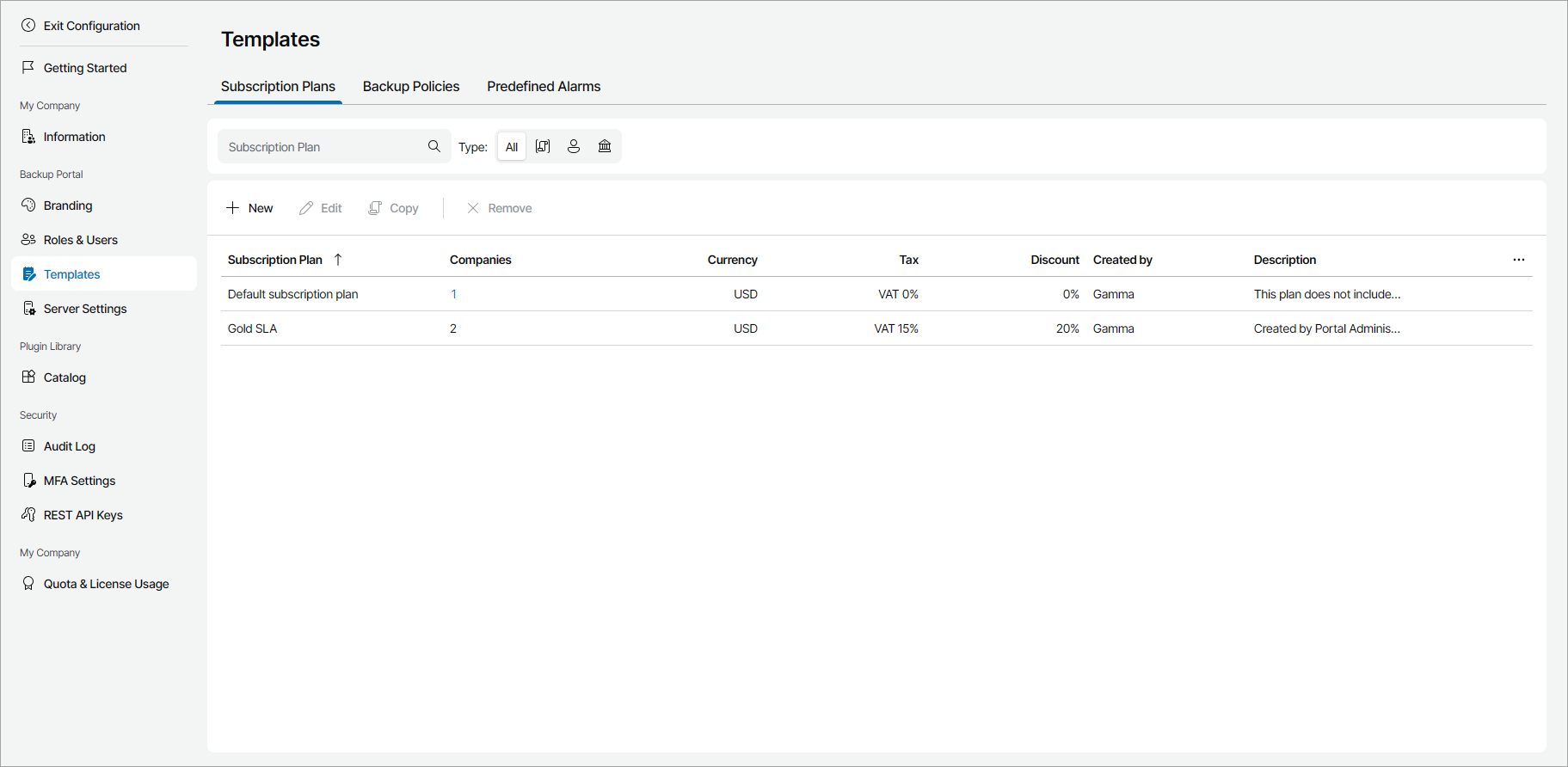 - In the configuration menu on the left, click Templates and navigate to the Subscription Plans tab.