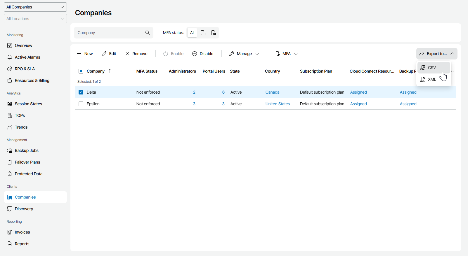 Veeam Service Provider Console will display a list of all registered company accounts.