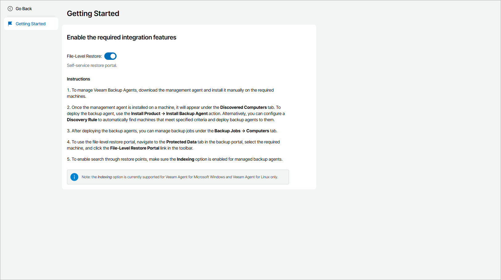 To access the file-level restore portal, you must enable the file-level restore functionality in Veeam Agent plugin. For details, see Enabling File-Level Restore.