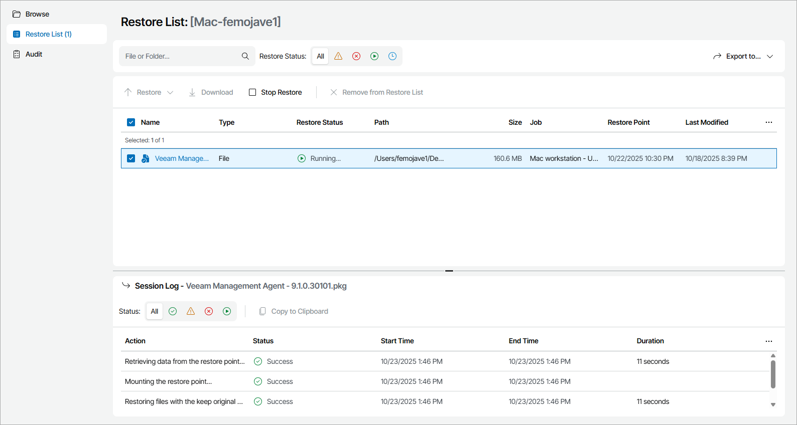 Veeam Service Provider Console will start the selected restore session. After you start restore, you can view restore session details in the Session Log section.