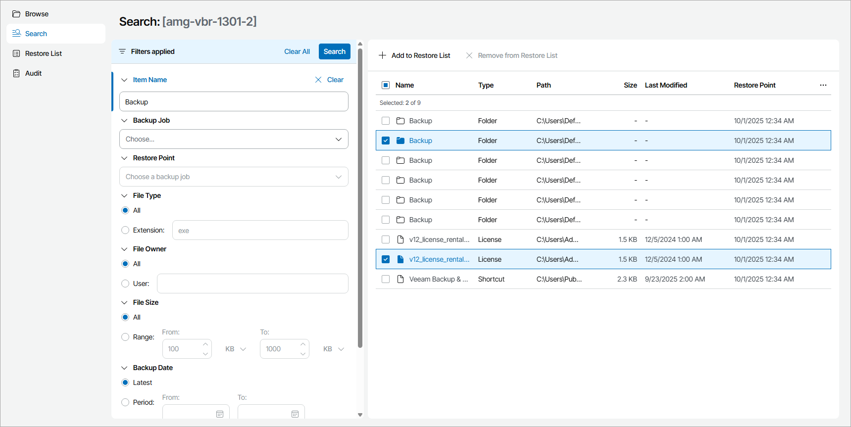 If the fields in the Search tab are not specified, the search results will include backed up items for all restore points of all configured backup jobs.