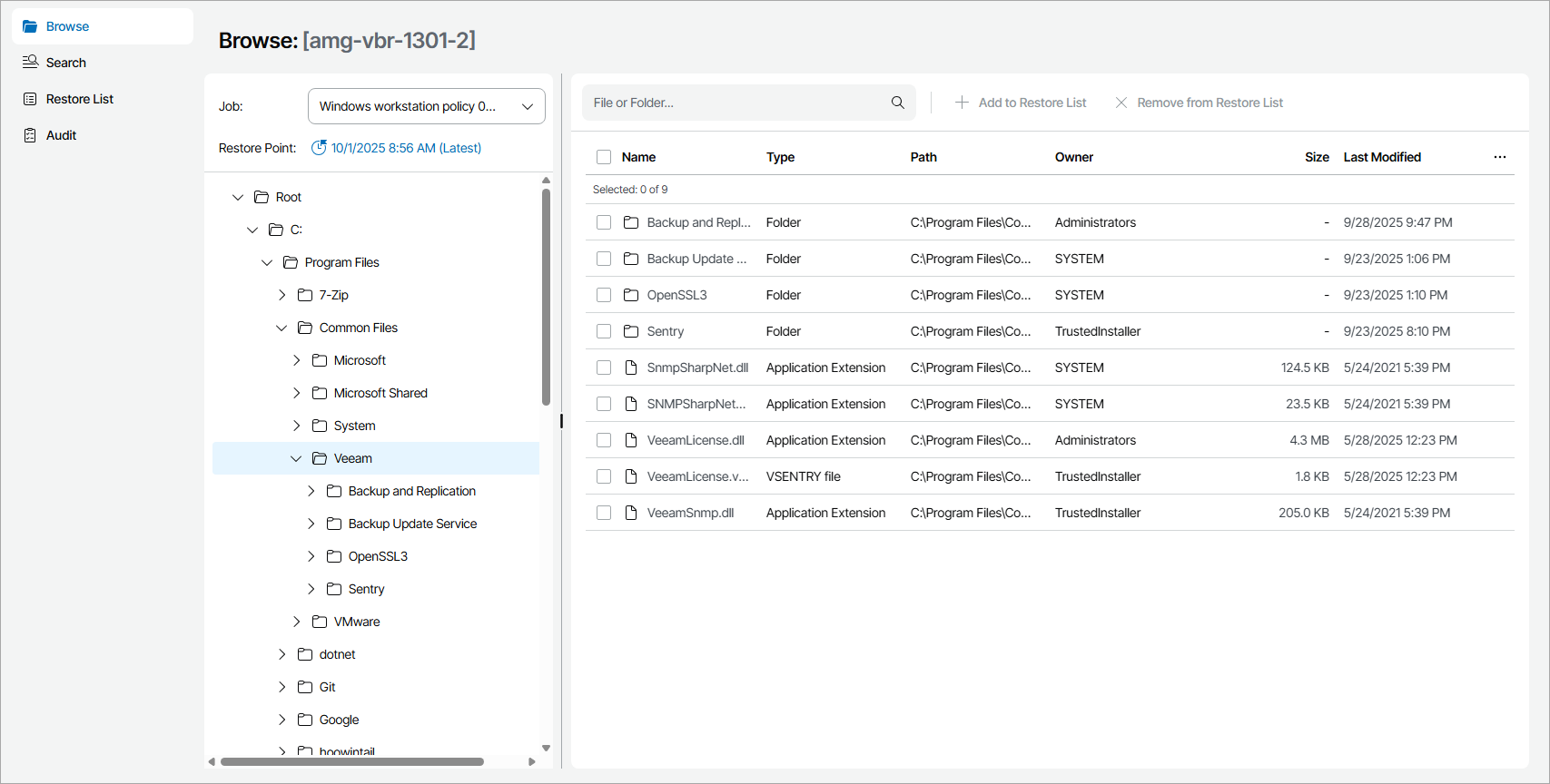 - In the Backup Job and Restore Point lists, select the backup job and the restore point from which you want to restore files.