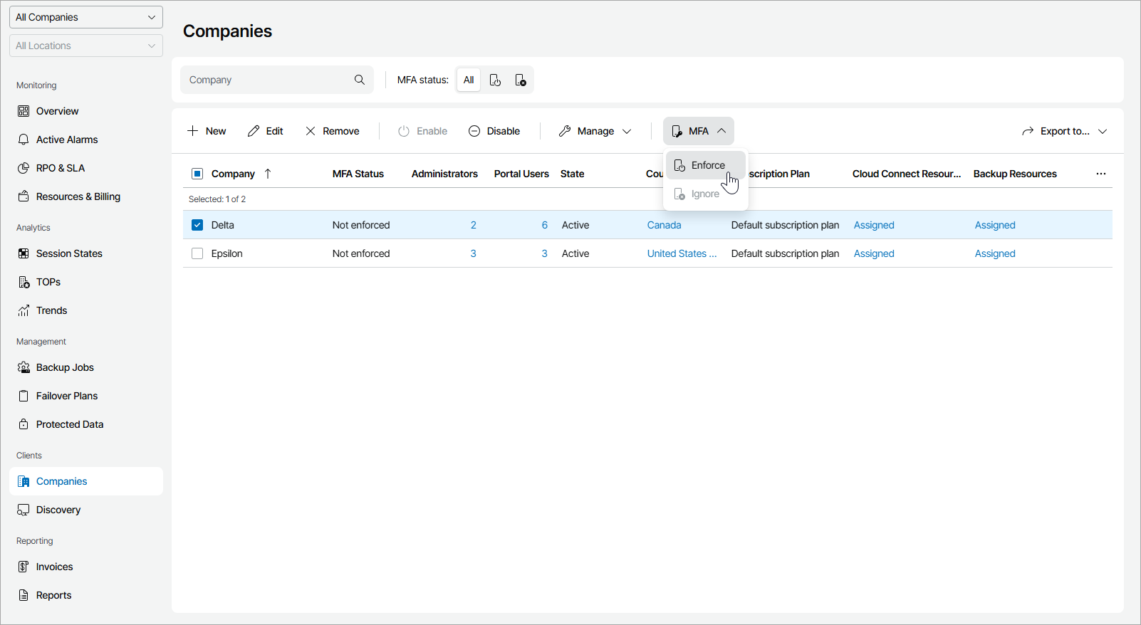 - From the drop-down list select Enforce to enable MFA or Ignore to allow company users disable MFA.