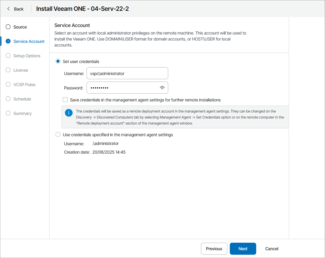 To store the user name and password as remote deployment account credentials in the management agent, select the Save credentials in the management agent settings for further remote installations check box. This will allow you to use these credentials to upgrade the Veeam ONE server in Veeam Service Provider Console.