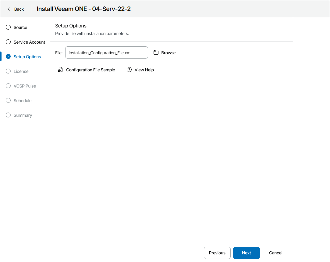 - At the Setup Options step of the wizard, specify path to an XML file with installation parameters.