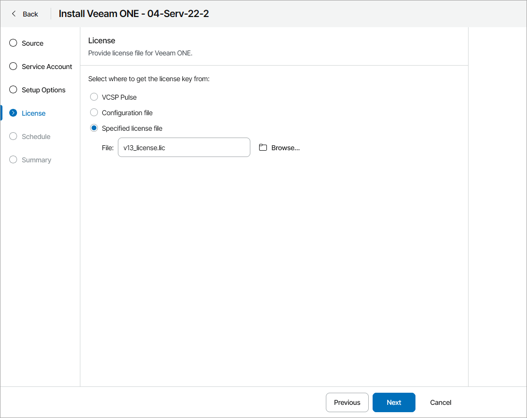 - VO_LICENSE_FILE — path to the license file on the machine where you want to install Veeam ONE. If you want to install VCSP Pulse license or provide the license file manually, leave this parameter empty.