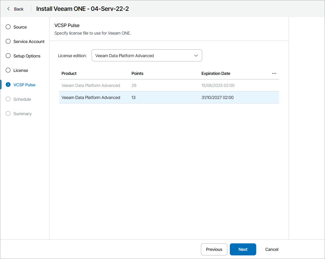 - [If you have selected VCSP Pulse at step 9] At the VCSP Pulse step of the wizard, select the necessary license key in the list.