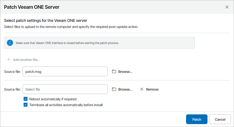 - Click Browse and select a patch file that must be executed on the Veeam ONE servers.