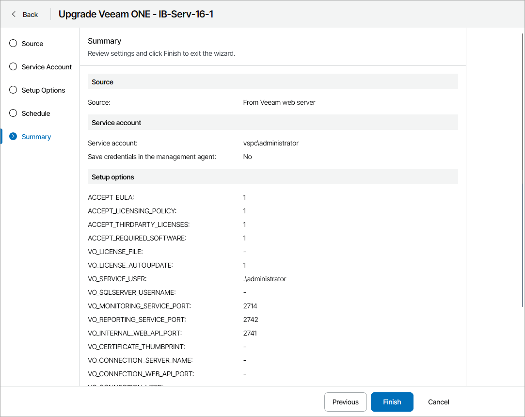- At the Summary step of the wizard, review upgrade settings and click Finish.
