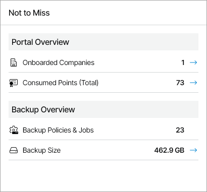- Onboarded Companies section shows the number of companies managed in Veeam Service Provider Console. The arrow indicates whether the trend has increased, decreased or remained the same in the last 30 days.
