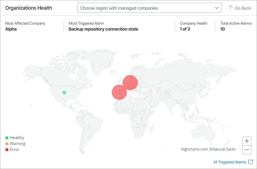 To view active alarms triggered for the selected country, click a region. Veeam Service Provider Console will open the Active Alarms dashboard. For details on working with alarms, see Working with Triggered Alarms.