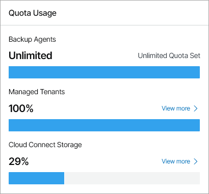This widget shows the amount and ratio of consumed and available resources allocated to your company. The sections in the widget show the quota used by managed backup agents, the amount and ratio of used and available storage quota allocated for Veeam Cloud Connect resources, and the number of cloud tenants managed in Veeam Service Provider Console.