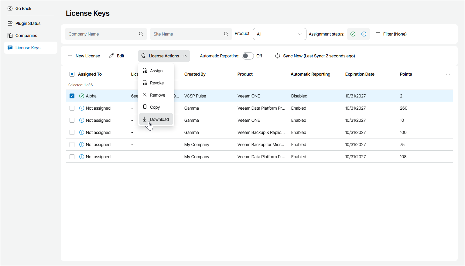 You can view license keys created in Veeam Service Provider Console plugin and in VCSP Pulse and download assigned license key files.