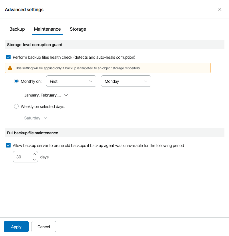 [For Veeam backup repository and cloud repository targets] On the Maintenance tab of the Advanced Settings window, specify maintenance settings for the backup chain created with the backup job: