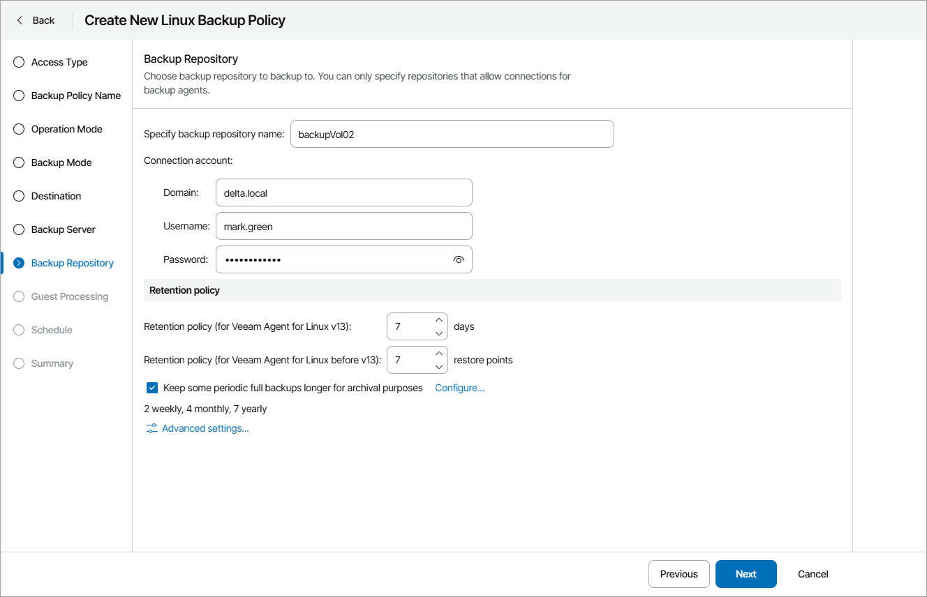 Permissions on the backup repository managed by the target Veeam backup server must be granted beforehand. For details, see section Setting Up User Permissions on Backup Repositories of the Veeam Agent for Linux User Guide.